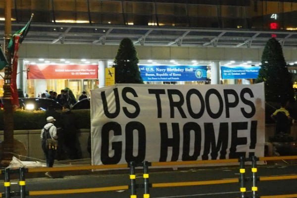 The Busan Haeundae grand hotel is where movie directors and actors/actress used to stay together whenever there is the Busan international film festival (Currently there is Busan intl. film festival, too). The United States Forces of Korea made a party in the 2nd floor of the hotel, in celebration of 60 year anniversary of creation of the the United States Naval Forces Korea. And there were people’s protest to them, “U.S. Troops, Go back home.” The media says there are people’s 24 hour protest in front of the headquarter of the US Naval Forces Korea in protest ti Trump and US Submarine Michigan which entered Busan on Oct., 13.