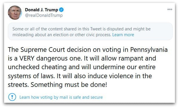 During a rally in Scranton on Monday, Trump—who has openly said that he’s “counting on the federal court system” to declare an election winner before all legally submitted ballots are counted—vaguely warned that “when the Supreme Court gave [Pennsylvania] an extension, they made a very dangerous situation. And I mean dangerous, physically dangerous.”