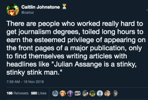 So they’re already regurgitating propaganda narratives straight from the lips of the Trump administration, but more importantly, their argument is nonsense. As I discuss in the essay hyperlinked here, once the Assange precedent has been set by the US government, the US government isn’t going to be relying on your personal definition of what journalism is; they’re going to be using their own, based on their own interests. The next time they want to prosecute someone for doing anything similar to what Assange did, they’re just going to do it, regardless of whether you believe that next person to have been a journalist or not. It’s like these people imagine that the US government is going to show up at their doorstep saying “Yes, hello, we wanted to imprison this journalist based on the precedent we set with the prosecution of Julian Assange, but before doing so we wanted to find out how you feel about whether or not they’re a journalist.”