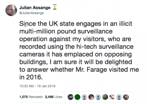 “Since the UK state engages in an illicit multi-million pound surveillance operation against my visitors, who are recorded using the hi-tech surveillance cameras it has emplaced on opposing buildings, I am sure it will be delighted to answer whether Mr. Farage visited me in 2016,” Assange tweeted in January 2018.