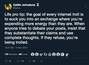 This one’s important. The internet is full of genuinely trollish individuals who spend their time acting out their inner pain by trying to suck the life out of other people, and political discussion is certainly no exception to this. A common tactic is to use short phrases, half-thoughts, or word salads which contain few facts and no actual arguments, but contain just enough of a jab to suck you into wasting energy making thorough, well-sourced arguments while they just lean back and continue making weak, low-energy responses to keep you going. This enables them to waste your time and frustrate you while expending little energy themselves, while also not having to reveal the fact that they don’t know much about the subject at hand and don’t really have an argument.