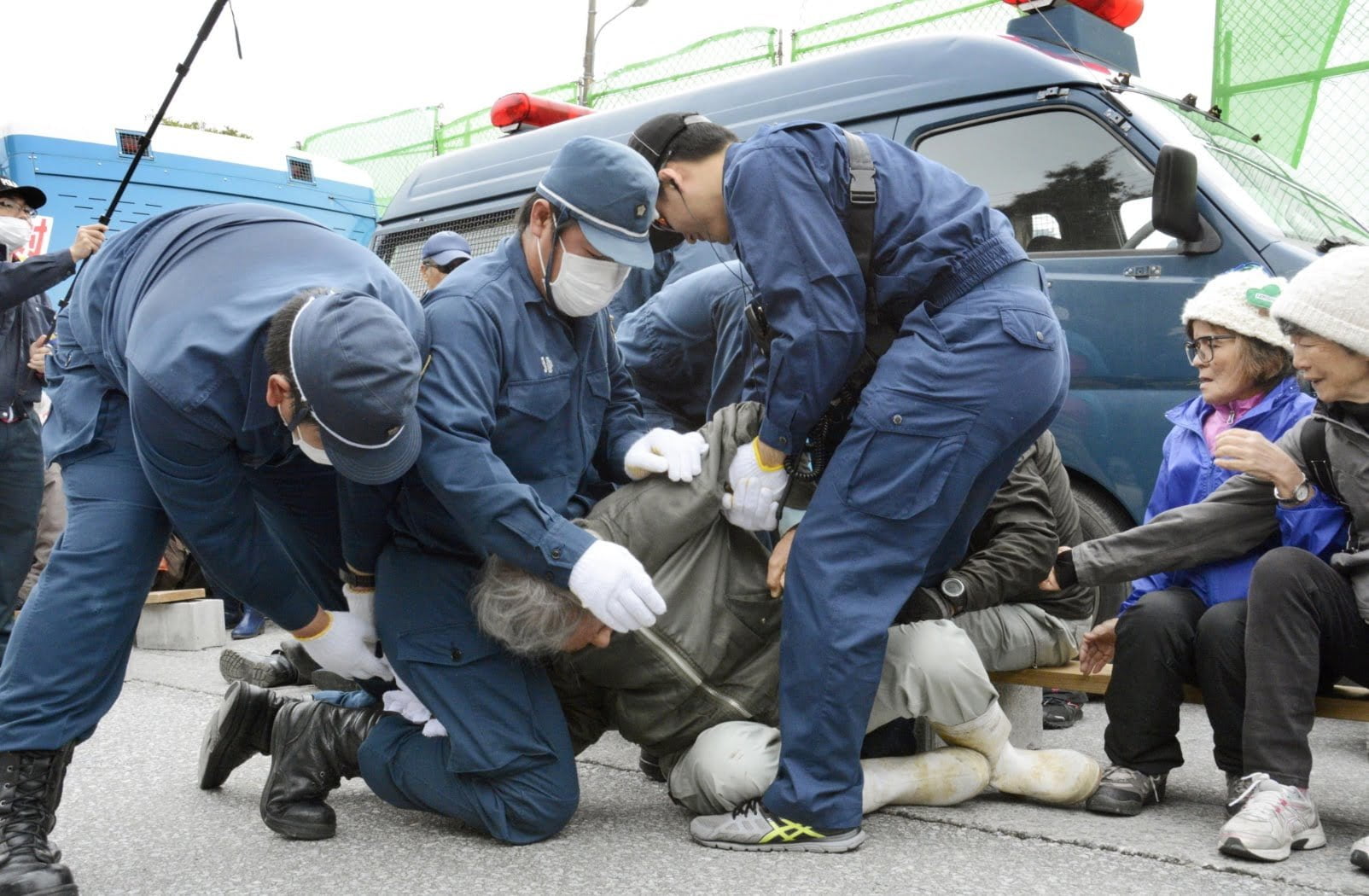 NAHA, OKINAWA PREF. – Government workers on Monday resumed offshore work off the coast of Nago, Okinawa Prefecture, to build the replacement facility for U.S. Marine Corps Air Station Futenma as protesters gathered to halt the project. Some 100 protesters started gathering at dawn in front of the gate of Camp Schwab next to a site for reclamation work to block construction vehicles from entering. At around 9:30 a.m., riot police tried to remove protesters sitting in front of the gate with their arms crossed. The protesters shouted, “Stop violence!” and “Don’t hurt the Okinawans!” “I saw vessels coming on TV, and I couldn’t just sit around doing nothing,” said a 70-year-old man from Urasoe. “Okinawa can’t stay like a colony of Japan and the U.S.” The work began after U.S. Defense Secretary James Mattis and Prime Minister Shinzo Abe agreed last week to go ahead with the base relocation.